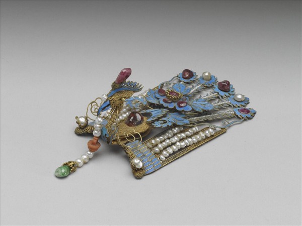 以鳳為單元組合成的鳳鈿,華麗異常。包含頭頂上最大面積的鈿尾、額間五片長形鈿花、正中央展翅的鳳鳥、兩側各一片橫長形鈿花,以及眉上垂著流蘇的鈿口。鳳鳥的尾部為點翠嵌寶石,雙翅以珠串表現平行的線條,再連接挺立的金纍絲鳥首及鳥身,結構清晰,整齊有序。每一隻鳳鳥嵌飾的寶石不全然相同,更增加炫麗的光彩。