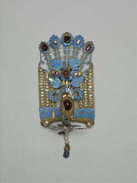 以鳳為單元組合成的鳳鈿,華麗異常。包含頭頂上最大面積的鈿尾、額間五片長形鈿花、正中央展翅的鳳鳥、兩側各一片橫長形鈿花,以及眉上垂著流蘇的鈿口。鳳鳥的尾部為點翠嵌寶石,雙翅以珠串表現平行的線條,再連接挺立的金纍絲鳥首及鳥身,結構清晰,整齊有序。每一隻鳳鳥嵌飾的寶石不全然相同,更增加炫麗的光彩。