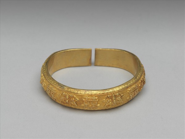 長條型捲成環形,可伸縮,剖面為扁圓形。面飾粟米金珠為地,相間浮雕囍字與蝴蝶紋。中空,內有小珠,搖晃時發出清脆響聲。