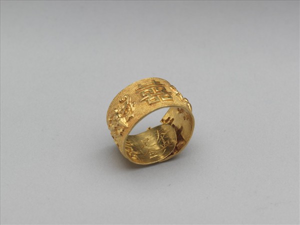扁平長條型金片捲成圓筒狀,粟米金珠為地,浮雕囍字及蝴蝶為飾。