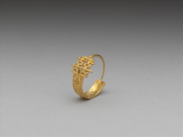 穿孔式耳環,環面一鏤空囍字,下相間浮雕喜字與蝴蝶紋,粟米金珠為地。