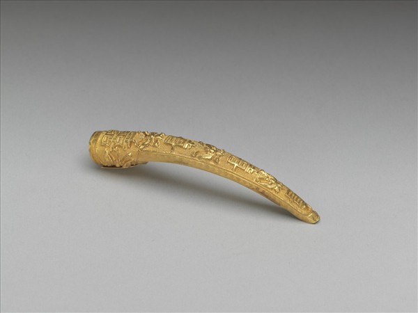 弓形,自基至指尖漸細,基背包合,可伸縮。面以粟米金珠為地,相間浮雕喜字與蝴蝶紋,基部浮雕雙蝴蝶夾囍字紋,緣飾廻紋。