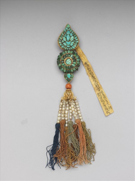 大小三圓連接之金座中,嵌各色綠松石。最上者背面附掛鉤,下端垂飾珊瑚珠、珍珠七串,及各色旒蘇。黃籤:乾隆四十三年十一月二十八日收。(故雜8318~8319為一對)