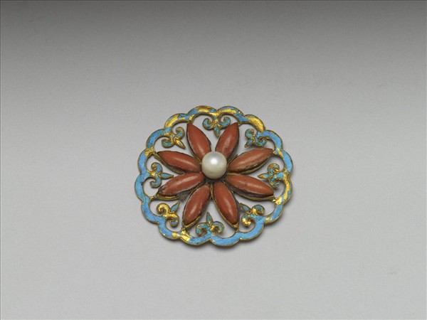 團形座,周飾點翠,正中八瓣菱花,每瓣皆嵌珊瑚,正中嵌珠一。此器與故雜8322為一對。
