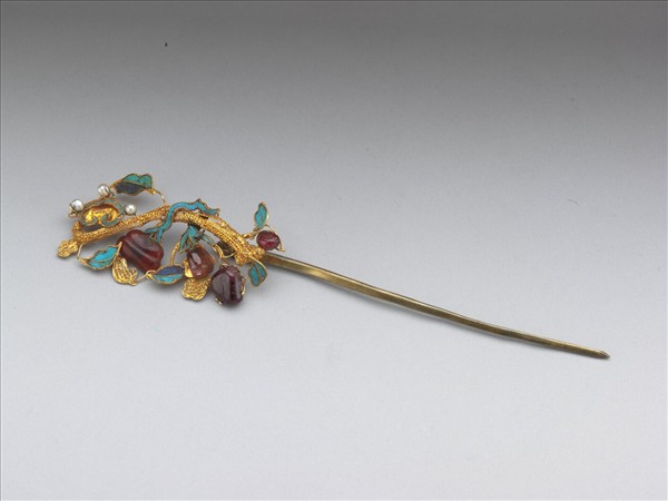 以金纍絲長柄如意為中心,如意柄呈大弧形彎曲,歧出的枝葉及數顆果實正好填補空白的弧形,如意首點綴米珠三顆,突出「如意」主題,形成一種不平衡的動勢。