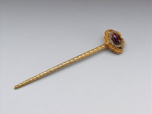 鏤空菱格形空心簪挺,簪首作如意形,金纍絲框出如意的輪廓與側面的厚度,鏤空雲紋為面,中央嵌紅色尖晶石,背面為金纍絲雙錢紋、團壽紋。金纍絲的如意首通氣簪在乾隆朝已存在,道光朝持續使用,是一種基本簪形。