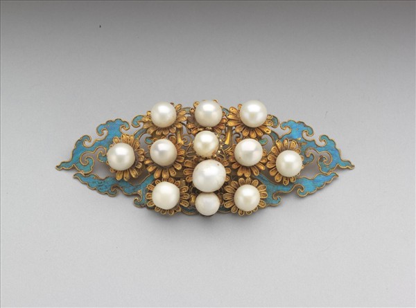 長菱形。點翠雲紋,纍絲菊花十朵,共嵌東珠十二顆。