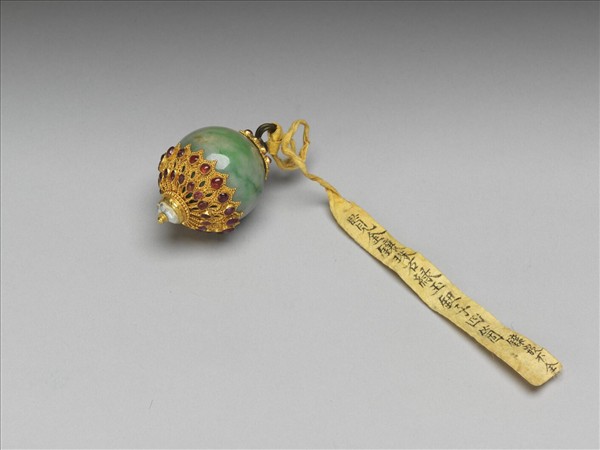 翠玉球形鈕子,頂和底粟珠紋金座中鑲紅色寶石等。(故雜8446~8449為一組)