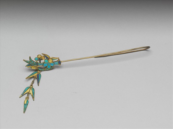 細挺。首與流蘇皆點翠裝飾,首作梅竹紋,流蘇三層,上二層由二片竹葉組成,末層僅一片竹葉。首之點翠多為淺藍色翠羽黏飾,流蘇之點翠由淺藍與深藍翠羽黏飾,但深藍點翠大多已脫落。