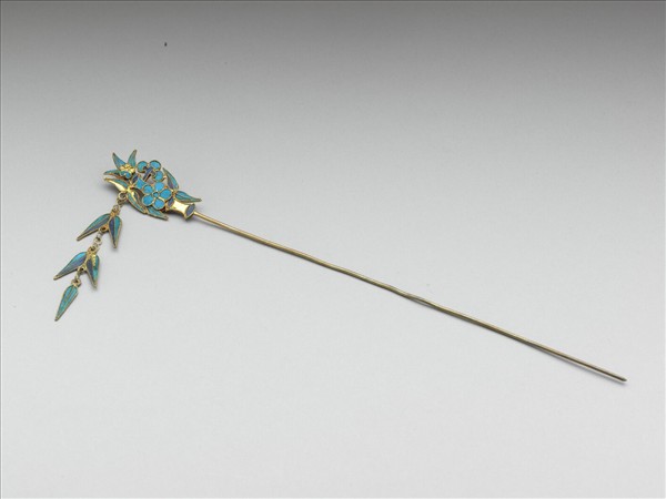 細挺。首與流蘇皆點翠裝飾,首作梅竹紋,流蘇三層,上二層由二片竹葉組成,末層僅一片竹葉。首之點翠多由淺藍色翠羽黏飾,流蘇之點翠由淺藍與深藍翠羽黏飾。