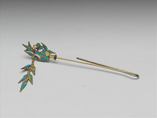 細挺。首與流蘇皆點翠裝飾,首作梅竹紋,流蘇三層,上二層由二片竹葉組成,末層僅一片竹葉。首之點翠多由淺藍色翠羽黏飾,流蘇之點翠由淺藍與深藍翠羽黏飾。