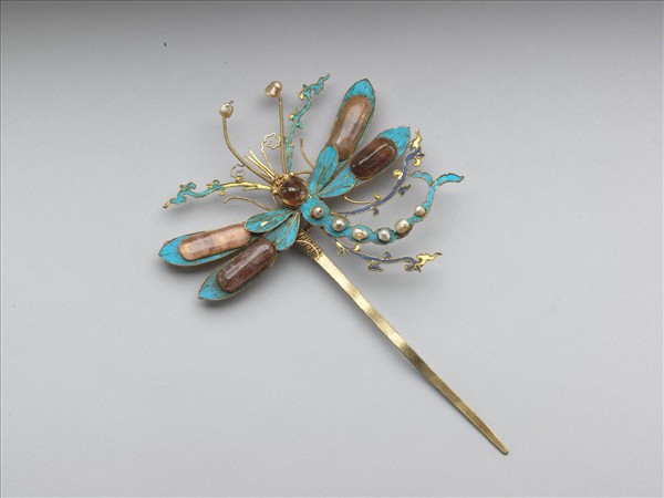 展翅翱翔的蜻蜓,身體迎風彎起,雙層的翅膀以點翠的小翅加上嵌碧璽的長翅構成,兩條飛舞的飄帶由前至後隨身形揚起,使雙翅的厚重感頓時變得輕盈許多。整件作品透過略為偏離中軸對稱平衡的佈局,而增加動感,並運用動勢的弧形線條,營造出秀雅的氣息,充分說明嘉慶朝的風格特色。