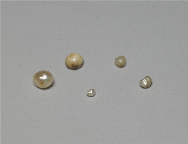 故雜008569-故雜008573為珍珠五顆。此為其中之一,珍珠呈圓錐形,底部有些許褐色斑點。