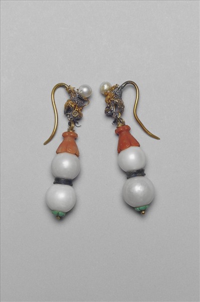 耳墜三副(故雜8578-8580),上端各以纍絲龍首鑲東珠一顆,龍口銜珊瑚寶蓋綴東珠二顆,間以青金石環,尾端飾點翠花托。帶弧狀彎鉤的耳墜,又名「鉗」。滿族貴族婦女有一耳穿三孔,佩戴三鉗的習俗。依據清代服飾制度,后妃著禮服時,雙耳配帶三件式耳墜,各以「金龍銜一等東珠為飾」。此三副一組耳墜配有木匣及黃綾,呈現三鉗耳飾在清宮存貯收藏的樣貌。