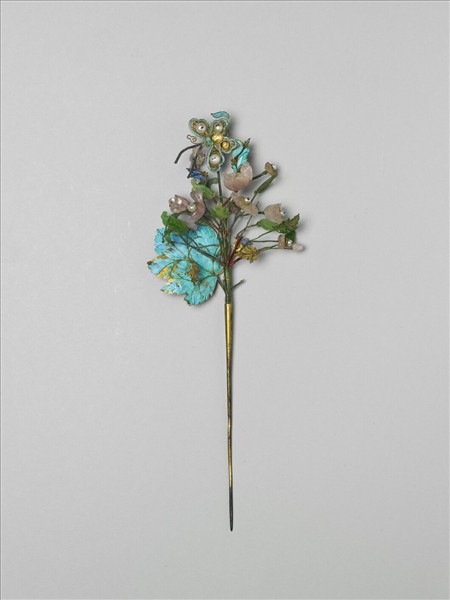 銀鍍金簪,簪首作蝶飛於點翠葉紋上,由數股金屬絲接合於細鋌,珠翠層疊簇擁,華麗繽紛。簪頂蝴蝶以纍絲為座,前端作纍絲長條形為觸角,佩帶時隨人顫動、搖曳生姿。蝶身與左後翅的圓形淺托上嵌珠脫落,餘前後翅各鑲嵌一小珍珠,點翠沿翅環飾。數朵珠花以粉紅碧璽琢成花瓣形,纍絲蕊座嵌飾小珍珠作花心,綴飾玉石小葉數枚。襯底的大片點翠錘鍱葉脈清晰,正面以淺藍色翠羽黏飾,背面則以深藍色翠羽飾之。部分珠花、點翠脫落不全,兩枚大點翠葉已傷斷。