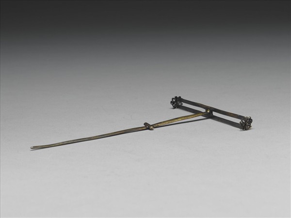 銀鍍金釵頭,釵頭為H形,與挺接連成T形。釵頭兩側做成花蝶般的鏤空圖案,素挺,有傷。