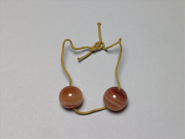 瑪瑙珠,呈橘棕色,滿佈不透明的紋帶塊體,天然結晶紋理,層次清晰可見。珠身開有一孔,以黃縧串繫另一件瑪瑙珠(故雜8601)。有傷綹。