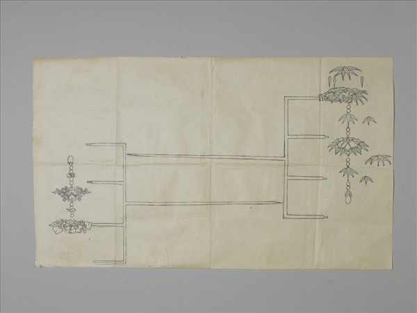 髮簪圖案紙地,以墨線白描兩支髮簪。簪首均於素挺上分出四股,繪有解構的步搖墜飾設計示意圖案。左簪主要圖案,上為蝙蝠、桃實,間以珠串,接連卍字裝飾,下接珠串、桃實與墜角。右簪以竹葉紋為主要圖樣,上以竹節紋樣為底,滿布竹葉,竹葉尖端繪有小米珠;下間以珠串及竹葉,中飾橫段竹節與葉,下接珠串與竹葉,以寶蓋墜角作收。此件竹葉簪紋樣曾見於院藏,可能為點翠材質的設計圖稿。
