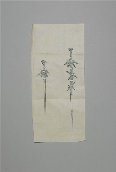 髮簪圖案紙地,以墨線白描填綠彩竹葉簪兩支,左短右長。簪首均以竹節造型為座,每段竹節繪有鉛白珠綴飾,各段葉柄處點一顆大鉛白珠。竹節又有引申為「氣節」、「君子」的貞潔象徵,整體設計亦取節節高升之意。