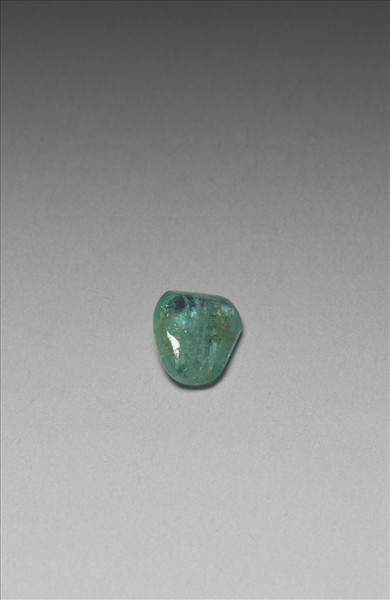 半透明湖綠色碧璽料,呈委角塊狀,可見內有絲狀天然結晶紋理。此件可能為配飾選樣的材料。