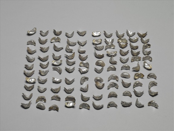 銀鑄小型銀錠一批,各個狀如小舟,共計壹百錠。附黃色包裝紙墨書「二錢重一百個」。