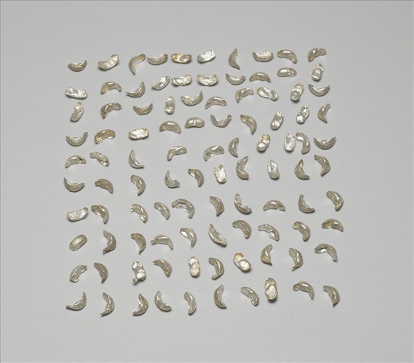銀鑄小型銀錠一批,各個狀如小舟,共計壹百錠。附黃色包裝紙墨書「一錢銀錁一百個」。