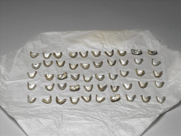 銀鑄小型銀錠一批,各個狀如小舟,共計五十錠。附黃籤墨書「三錢重銀錁五十箇」。