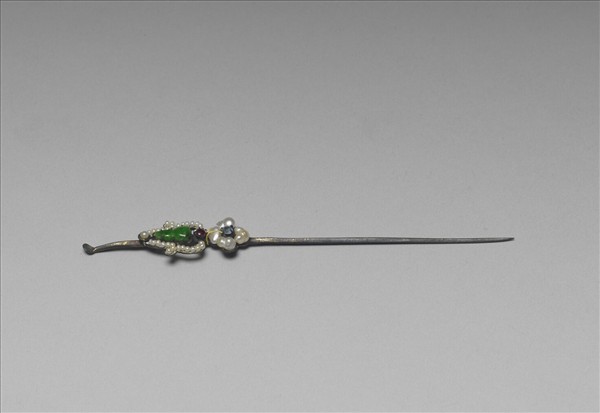 銀鍍金耳挖簪。簪首前端為耳挖,分上下兩部分作帶花葫蘆式。上部嵌飾一翠玉葫蘆,周圍以米珠鑲邊,玉葫蘆底部嵌一顆紅色寶石為飾。下部花型座內嵌四粒飯塊珠作花瓣,花心鑲一藍色寶石。素挺鍍金脫落。附寶藍色長型絨盒一只。