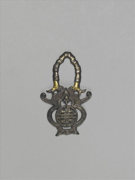 片狀金屬飾片,整器由上而下,分以鏨刻錘鍱技法製作出如竹節之提梁、蝙蝠、碩腹帶座飾有團壽字的花籃。蝙蝠不只與團壽字共同傳達「福壽」之吉祥寓意,其張翅遠望如瓶身之侈口,亦使整器外廓如帶提梁之花籃,可說是兼具吉祥與巧思的製作。