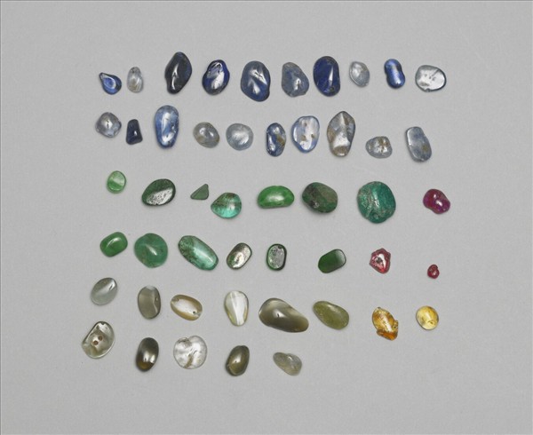 各色寶石,共四十九塊,有寶藍、翠綠、黃、銀白等色,表面有漂亮的光澤而稍透明,大部分的形狀與卵石接近,也有的已經琢為片狀。從有些已經鑿有穿孔的狀況看來,這些可能是製作其他器物時所用配件。