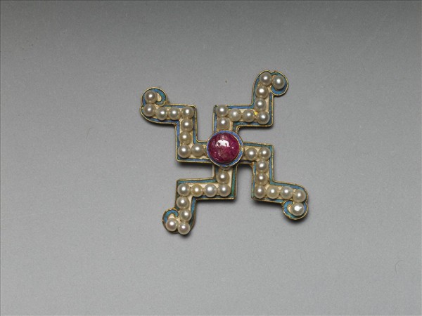 金屬「卍」字形片狀飾。「卍」字邊廓點翠,面上綴飾珍珠,中心嵌飾一紅色碧璽。點翠亮眼、珠寶飽滿富光澤,中央紅而圓的碧璽,又以其較深的色調來增添整器的配色豐富度,因而呈現悅目又華麗的視覺效果。