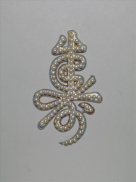 金屬片狀飾,即將金屬錘鍱為草書「壽」字,「壽」字上再綴飾珍珠而成。「壽」字邊廓點翠亮眼,珍珠粒粒珠圓玉潤,飽滿而充滿光澤,再加上金屬的鍍金所呈現的金黃色富貴之氣,共同顯示出器物的華麗與價值非凡。