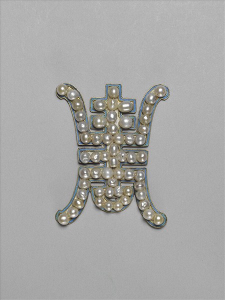 金屬片狀飾,即將金屬錘鍱為對稱狀的「壽」字,「壽」字上再綴飾珍珠而成。「壽」字邊廓點翠亮眼,珍珠或圓滾、或如卵石狀,或白或泛黃,粒粒皆光澤飽滿,再加上金屬的鍍金所呈現的金黃色富貴之氣,共同顯示出器物的華麗與價值非凡。