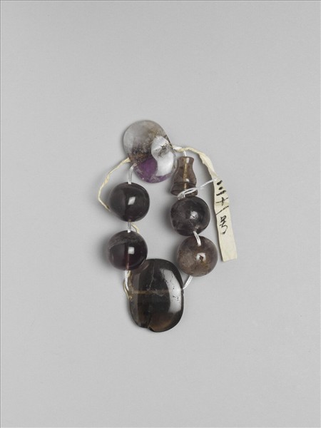 茶色略透的水晶,四個作圓珠狀,兩個作片狀而外型接近委角四邊形,一個外形像半個葫蘆。在製作朝珠時或念珠時,往往以與念珠材質不同的物質來製作佛頭、佛頭塔。而本組文物即是朝珠的組合零件,白色穿線為重新組合。