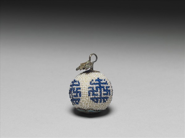 圓形鈕子,表面緝白地藍色團壽紋米珠。珠一端有金屬鉤,鉤端有蝙蝠形飾片。鈕子上下有花形飾片各一,上飾點翠。鈕上團壽字的筆劃變化成「卍」字,具有「萬壽」之吉祥意涵。