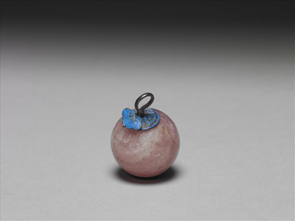 粉紅色碧璽鈕子,圓球狀,有通心穿,金屬條貫穿其間,固定了通心穿兩端的壽字紋金屬飾片。金屬條一端拗彎如鉤狀。碧璽粉紅略透,正與飾片上明亮的藍色互相襯托,一起吸引人們的目光。