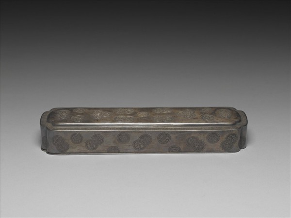 長方委角銀盒,主要裝飾集中在盒蓋,盒身光素無紋。蓋外壁素地飾團花果紋,即在圓形開光中鏨飾折枝花果。團花果在蓋外壁或獨立存在、或三兩交疊,使簡單的配置增加變化。盒內金屬隔層以鏤空錢紋錦地為飾,圓形圖案與盒外紋樣相應和,可見製作者的用心。