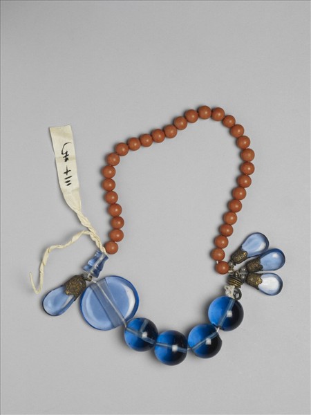 紅色圓珠與淺藍色各式玻璃。紅色珠僅三十粒,另有圓球狀、片狀、以及水滴狀的淺藍色玻璃,很可能是製作朝珠時所需的佛頭、背雲、墜角等素材,可知應為製作朝珠之材料,為保存便利,先以線穿起,以防散失。