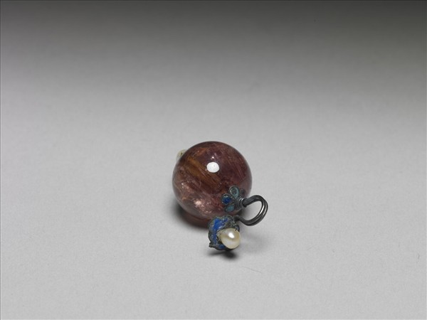 碧璽球形鈕,頂與底之金屬座和如意紋掛鉤中飾琺瑯彩並綴珍珠。鈕可用來扣合服裝開襟,或佩掛飾品。