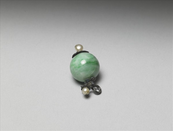 翠玉球形鈕,頂與底之金屬座和如意紋掛鉤中飾琺瑯彩並綴珍珠。鈕可用來扣合服裝開襟,或配掛飾品。