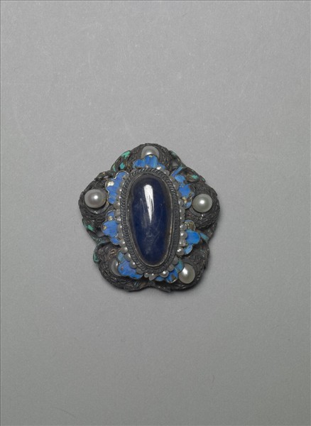帽正,綴飾在帽上額間的飾品,通常由珠翠寶石雕、嵌而成。本件為銀製五瓣花式座,中央嵌藍寶石、周圍嵌珍珠並貼飾點翠。背部有圈環以供穿線縫綴。