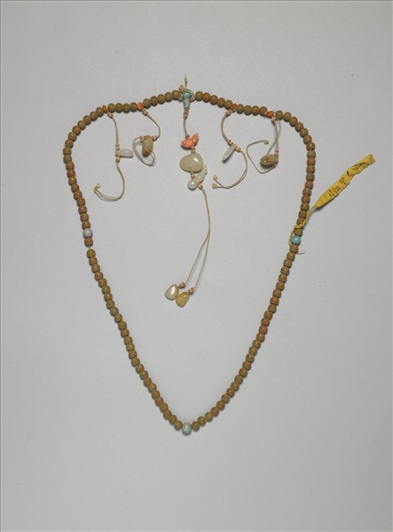 木質念珠,計有木質珠一百零八粒,每隔二十七粒加入一碧玉珠佛頭,三條記捻都穿以白玉墜角,碧玉質佛頭塔下接珊瑚與白玉質飾件與墬角。木質珠的黃褐色,以及白玉飾件的沈靜白色調,都帶給人一種素樸感,木質株上刻「壽」字紋裝飾。