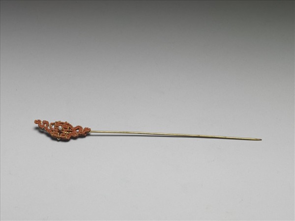 銅鍍金素鋌簪,簪首兩面均作「囍」字,「囍」字兩旁祥雲側生,有如被祥雲簇擁而浮於雲間,也凸顯「囍」字為簪首的裝飾主調,而「囍」字中央飾珍珠一顆,更顯貴氣。簪首之「囍」字與祥雲滿緝紅色珊瑚米珠,不只讓製作顯得細緻,也增添了不少喜氣。