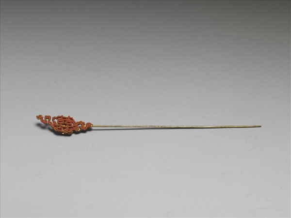 銅鍍金素鋌簪,簪首兩面均作「囍」字,「囍」字兩旁祥雲側生,有如被祥雲簇擁而浮於雲間,也凸顯「囍」字為簪首的裝飾主調,而「囍」字中央飾珍珠一顆,更顯貴氣。簪首之「囍」字與祥雲滿緝紅色珊瑚米珠,不只讓製作顯得細緻,也增添了不少喜氣。其中一面之珍珠已脫落。
