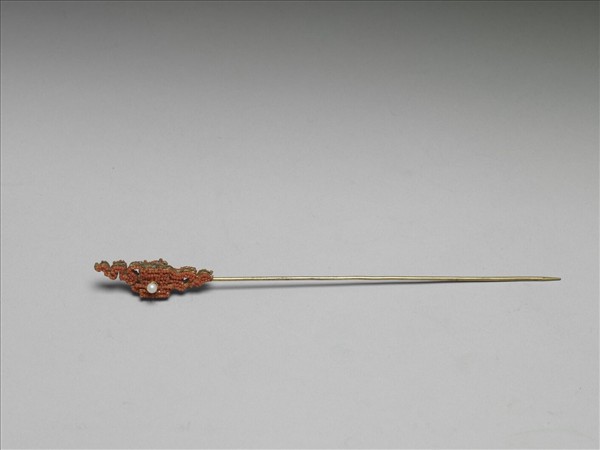 銅鍍金素鋌簪,簪首兩面均作「囍」字,「囍」字兩旁祥雲側生,有如被祥雲簇擁而浮於雲間,也凸顯「囍」字為簪首的裝飾主調,而「囍」字中央飾珍珠一顆,更顯貴氣。簪首之「囍」字與祥雲滿緝紅色珊瑚米珠,不只讓製作顯得細緻,也增添了不少喜氣。