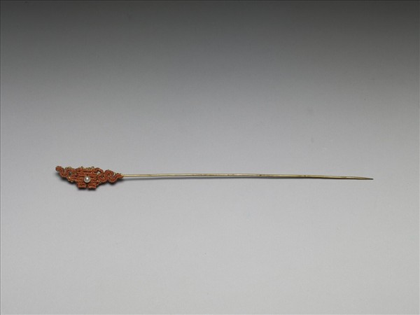 鍍金素鋌簪,簪首兩面均作「囍」字,「囍」字兩旁祥雲側生,有如被祥雲簇擁而浮於雲間,也凸顯「囍」字為簪首的裝飾主調,而「囍」字中央飾珍珠一顆,更顯貴氣。簪首之「囍」字與祥雲滿緝紅色珊瑚米珠,不只讓製作顯得細緻,也增添了不少喜氣。