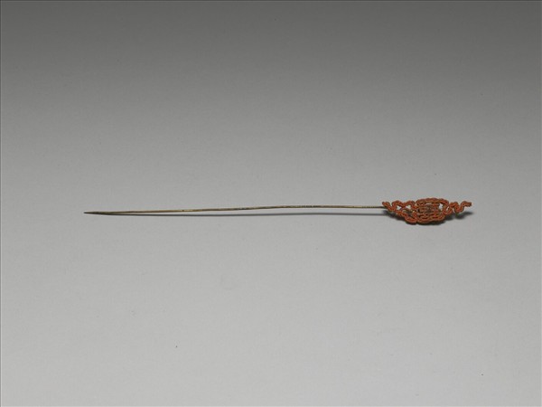 鍍金素鋌簪,簪首兩面均作「囍」字,「囍」字兩旁祥雲側生,有如被祥雲簇擁而浮於雲間,也凸顯「囍」字為簪首的裝飾主調,而「囍」字中央飾珍珠一顆,更顯貴氣。簪首之「囍」字與祥雲滿緝紅色珊瑚米珠,不只讓製作顯得細緻,也增添了不少喜氣。其中一面之珍珠已脫落。