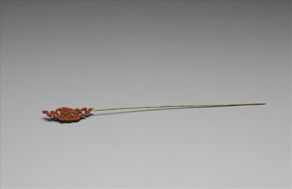 鍍金素鋌簪,簪首兩面均作「囍」字,「囍」字兩旁祥雲側生,有如被祥雲簇擁而浮於雲間,也凸顯「囍」字為簪首的裝飾主調,而「囍」字中央飾珍珠一顆,更顯貴氣。簪首之「囍」字與祥雲滿緝紅色珊瑚米珠,不只讓製作顯得細緻,也增添了不少喜氣。其中一面之珍珠已脫落。
