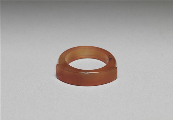 瑪瑙戒作馬鞍式,戒面呈長弧形,略突出戒環之外。全器光素,色澤圓潤,瑪瑙本質有天然斑塊。