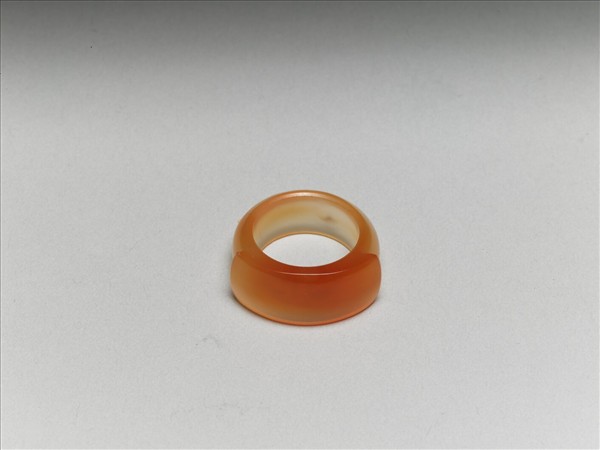 瑪瑙戒作馬鞍式,戒面呈長弧形,略突出戒環之外。全器光素,色澤溫潤,戒面色深。